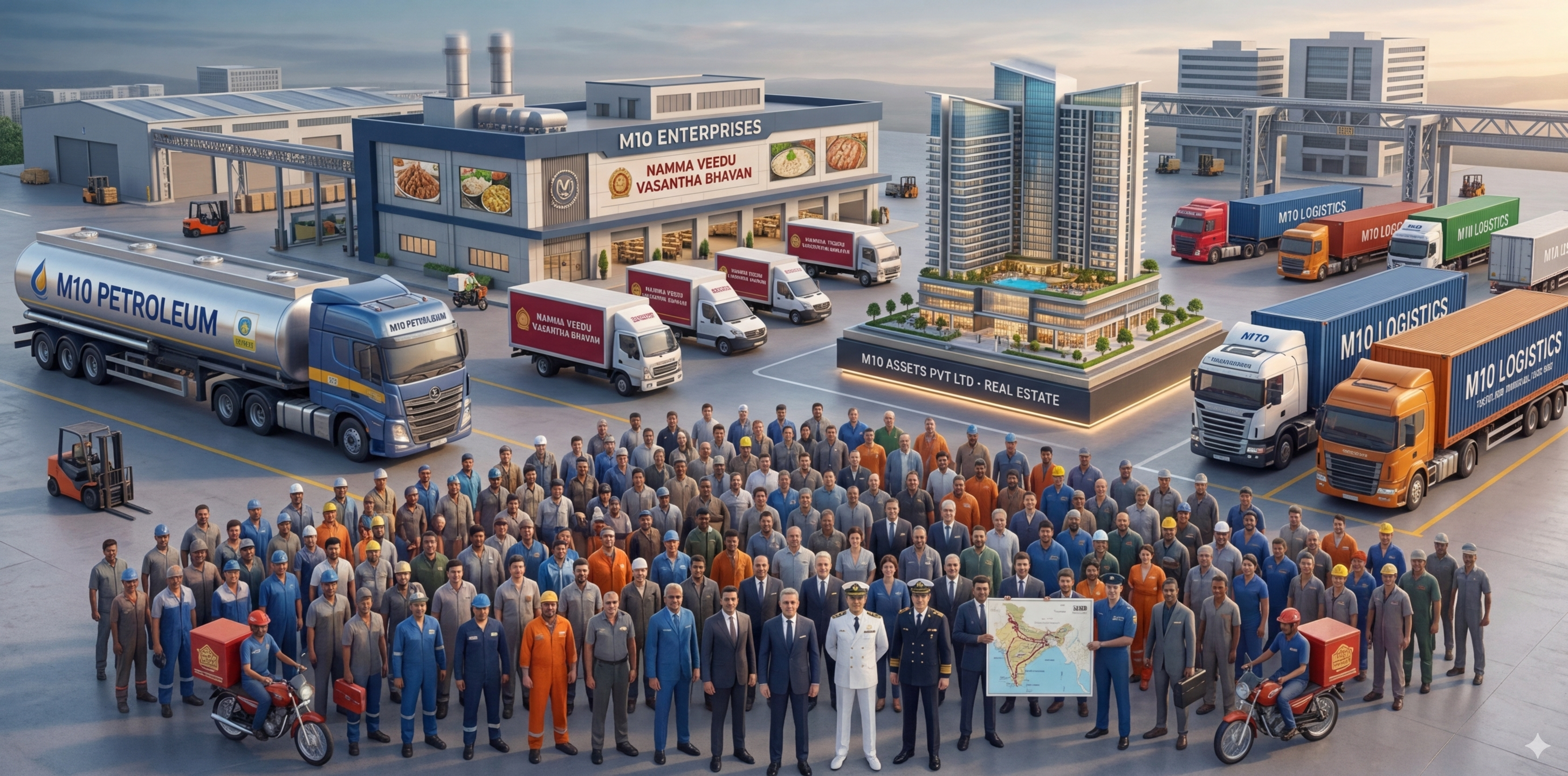 From 200+ trucks on India's national highways to BPCL fuel stations in Bangalore, from real estate holdings across Karnataka, Tamil Nadu, Telangana, AP and Kerala, to running the beloved Namma Veedu Vasantha Bhavan franchise on Hosur Highway — M10 Group is built on hard work, local expertise, and the relentless pursuit of growth.